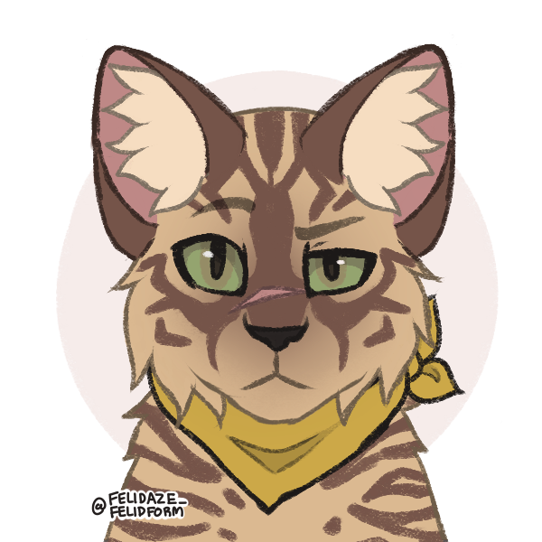 Appearance: Cinnamon is a tawny she-cat that has brown marbled markings throughout her body. Her ears are fully brown, and she has green eyes. She also wears a yellow bandana on her neck, in which her owners gave to her.